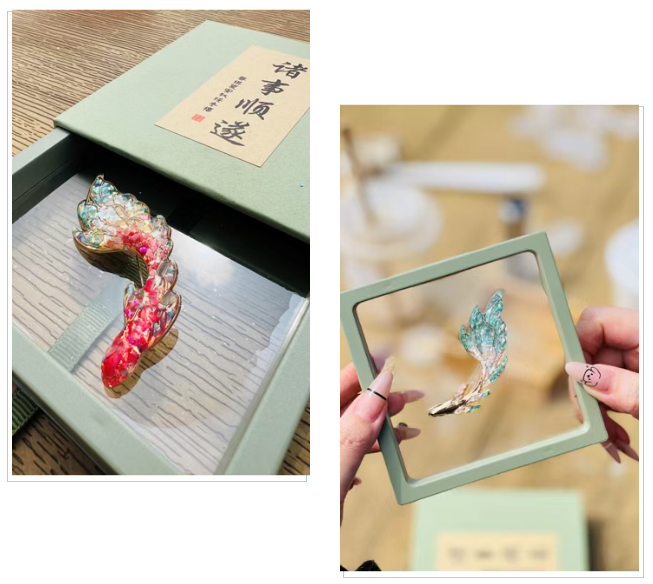 非遗体验环节,大家围坐在一起,在专业老师的指导下学习制作非遗螺钿胸针。螺钿工艺是中国传统的漆器装饰技法,以贝壳镶嵌之精妙、光泽变幻之瑰丽著称。大家认真聆听老师讲解螺钿的历史渊源与制作技巧,随后动手实践。从挑选贝壳、切割打磨到粘贴组合,每一个步骤都凝聚着专注与巧思。当一枚枚精美的螺钿胸针在手中诞生时,大家脸上洋溢着成就感与收获的喜悦,更为中国博大精深的传统文化感到自豪。