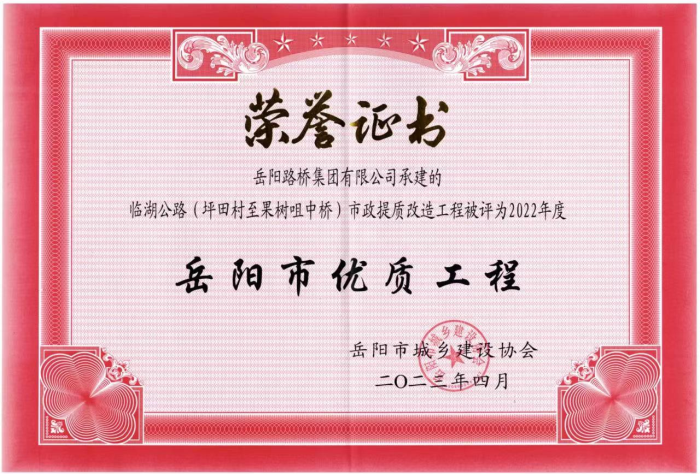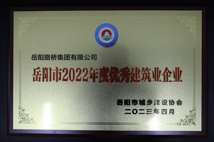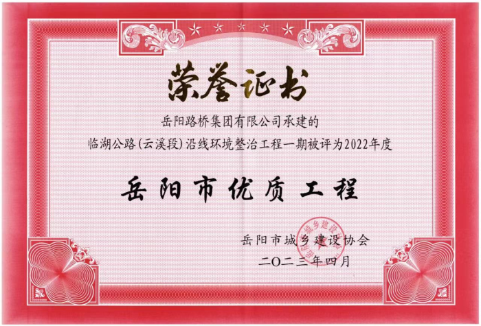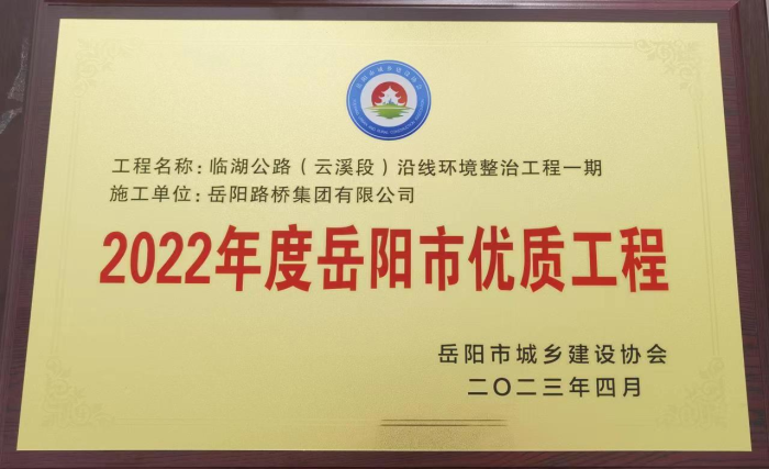 岳阳路桥集团获评岳阳市2022年度优秀建筑业企业、2022年度先进会员单位,公司承建的临湖公路(坪田村至果树咀中桥)市政提质改造工程和临湖公路(云溪段)沿线环境整治工程一期项目荣获岳阳市优质工程奖。公司职工曾霄和段立伟两位同志荣获岳阳市优秀项目经理荣誉称号。