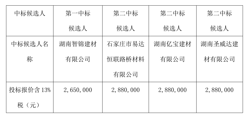 岳阳路桥集团有限公司于2025年12月24日9:30 (北京时间)对岳阳路桥集团有限公司-中铁五局集团有限公司联合体桂郴高速第1合同段减水剂采购进行了内部公开招标、开标、封闭评标。在集团公司成本管理部、纪检监察部、二分公司全过程监督下,评标委员会按照招标文件确定的评标办法进行了细致的评审,并推荐中标候选人排名如下: