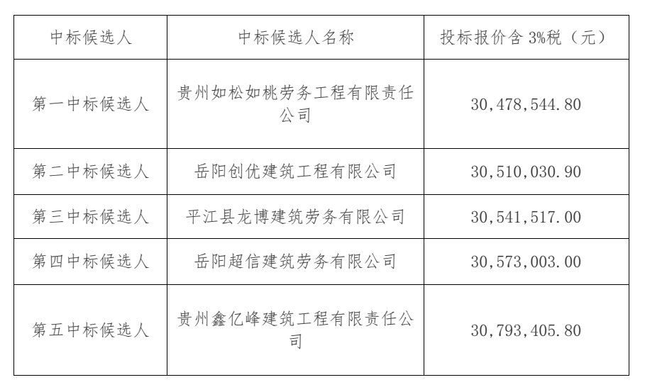 岳阳路桥集团有限公司于2026年1月20日10点30分(北京时间)对岳阳路桥集团有限公司-中铁五局集团有限公司联合体桂郴高速第1合同段锚杆防护进行了内部公开招标、开标、封闭评标。在集团公司成本管理部、纪检监察部、二分公司全过程监督下,评标委员会按照招标文件确定的评标办法进行了细致的评审,并推荐中标候选人排名如下: