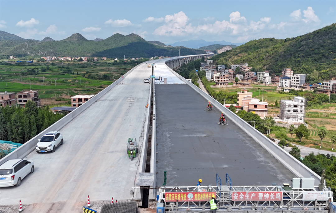 刘家桥特大桥是湖南省桂东至新田(宁远)高速桂阳至新田段控制性工程,大桥全长2377.5米,墩高最高达36.3米,桥梁上部结构采用预应力连续T梁,今年7月30日,刘家桥特大桥顺利全幅架通。桥面铺装是桥梁建设中的关键环节,在刘家桥特大桥桥面铺装施工中,项目引入了先进的RTK激光摊铺设备,可即时获取高精度定位并调整施工参数,实现全幅自动化作业,同时通过精准控制振动频率与摊铺速度,有效保障了桥面铺装的平整度和密实度,极大地减少了桥面铺装纵向施工缝的质量隐患通病,提升了工程质量和作业效率。为确保施工高效推进,项目团队在管理标准化、信息化、智能化建设上做了大量卓有成效的实践和创新,一方面,根据项目实际优化施工方案,科学调配资源,通过动态调整施工工序提升作业效率;另一方面严格落实安全技术交底制度,对钢筋安装、混凝土浇筑等关键环节实施全过程质量管控,全面强化现场安全管理与质量监控。